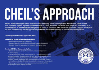 Under Armour are open for co-operation with Samsung on its running event: ‘All out mile’. ‘AOM’ event was launched 2 years ago and had a break due to Covid, however, the event took place in 4 continents in 5 countries and in 2022 the event has grown to cover 14 countries. The event will grow into a bigger event year on year and Samsung has an opportunity to take a role of a technology or sports innovation partner. Cheil suggest the following approach in 2022: Samsung NZ to fund prizes for event winners.
